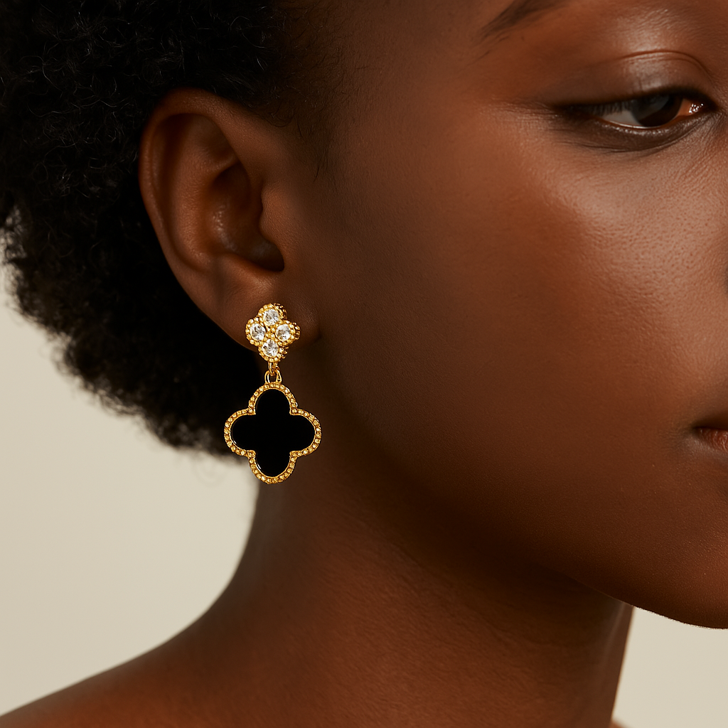 Bold meets classic with our Black Clover Drop Earrings. These Van Cleef-inspired dangles feature a crystal-studded clover stud and a sleek black enamel drop framed in shimmering stones. Lightweight yet luxe, these earrings bring instant elegance to any look — from everyday chic to special occasions.