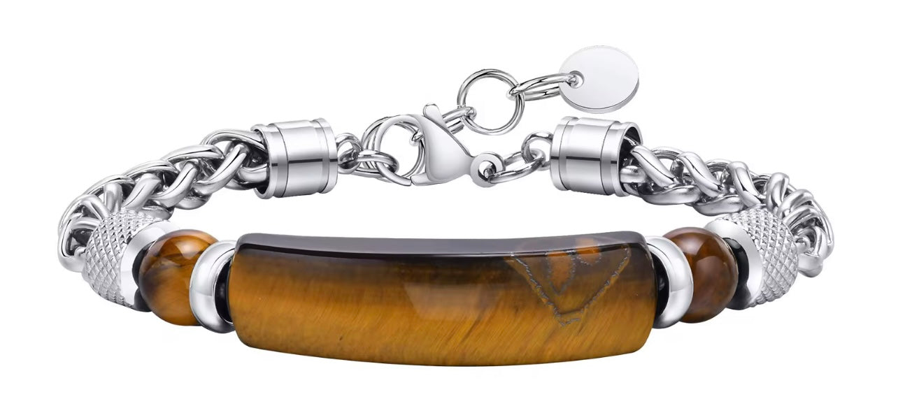 Elevate your style with this bold men’s bracelet featuring a polished stainless steel chain and a striking tiger eye stone centerpiece. The natural brown-golden hues of the tiger eye create a powerful and masculine look, while the durable stainless steel ensures long-lasting wear. Perfect for both casual and formal outfits.